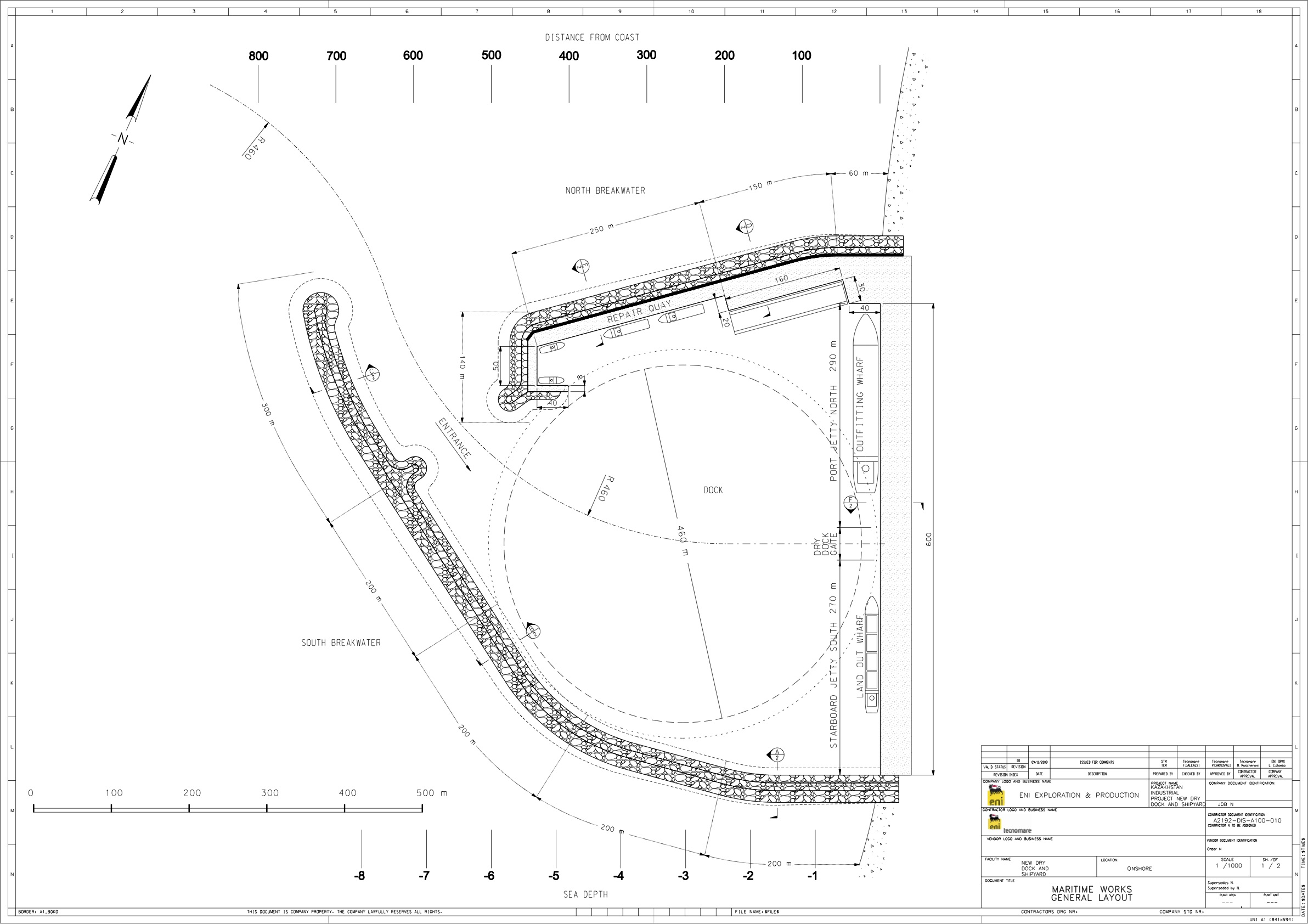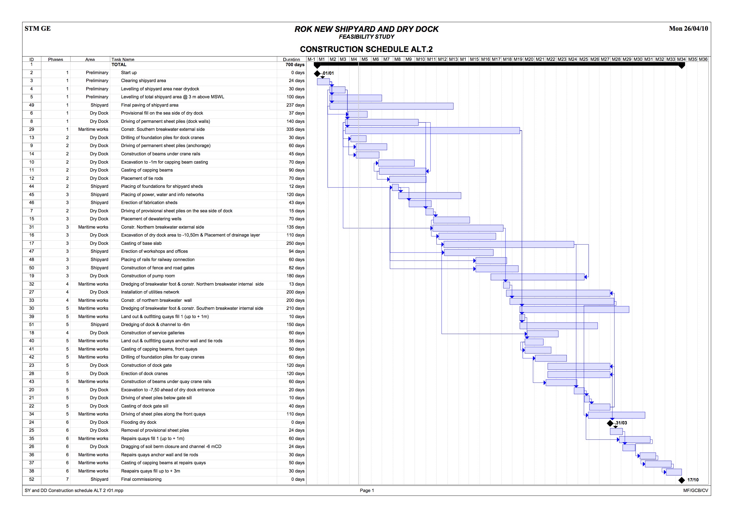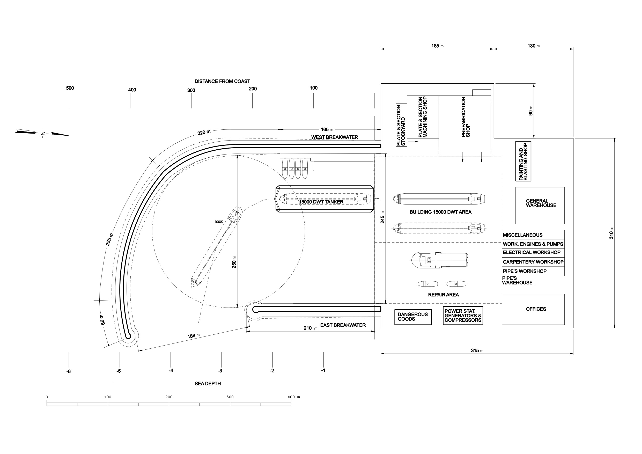 The study covers the feasibility and the cost assessment to erect a shipyard capable to build and maintain # 3 * 60.000 DWT tankers in # 3 years. Once the shipbuilding process has been finalized, areas, facilities and main items had been sized together with dry-dock, breakwaters and at sea works. Design has obtained the satisfaction of Kazakhstan Government following their and RMRS classification Rules. Several alternatives had been studied. I.e. a repair shipyard, a shipyard to build vessel up to 125 m and/or 60 m in LOA, etc. Material and costs had been assessed. Construction and repair Yards fitted with concrete dry-dock, alternative fitted with a syncro-lift, and/or with a floating dry-dock, all had been examined, assessed and compared for construction time schedule and relevant costs.